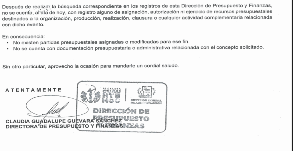 También se negó a aclarar el origen de los recursos con los que la alcaldesa ha realizado sus mítines políticos, incluyendo la organización y logística de su 1.º informe de Gobierno, declaró a inicios de noviembre de 2025.