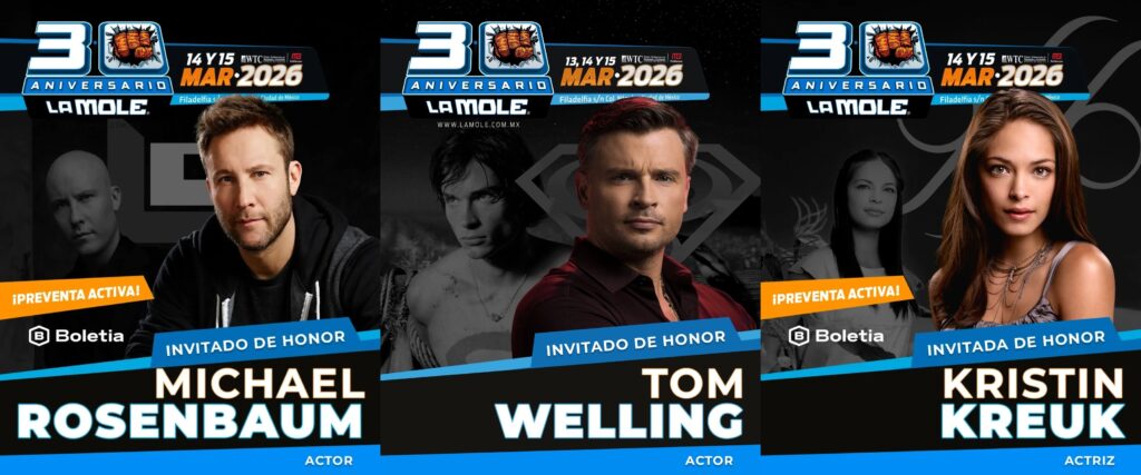 La convención de cultura pop “La Mole Convention” celebrará su 30 aniversario con la visita de parte del elenco de “Smallville”, encabezado por Tom Welling, Michael Rosenbaum y Kristin Kreuk. Los actores, recordados por sus papeles como Clark Kent, Lex Luthor y Lana Lang, llegarán a tierras mexicanas del 13 al 15 de marzo en el World Trade Center de la Ciudad de México, donde participarán en paneles, sesiones de autógrafos y fotografías.
