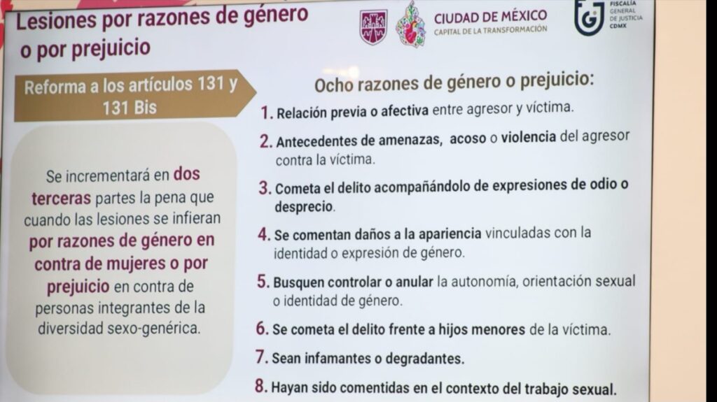 A pregunta expresa por Los Reporteros MX sobre la propuesta de la tipificacion del delito de agresiones por razones de género, la fiscal General de Justicia de la Ciudad de México, Bertha Alcalde Luján, informó que las reformas contemplan incrementar las penas por lesiones cometidas por razones de género o prejuicio hacia la orientación sexual o identidad de género.
