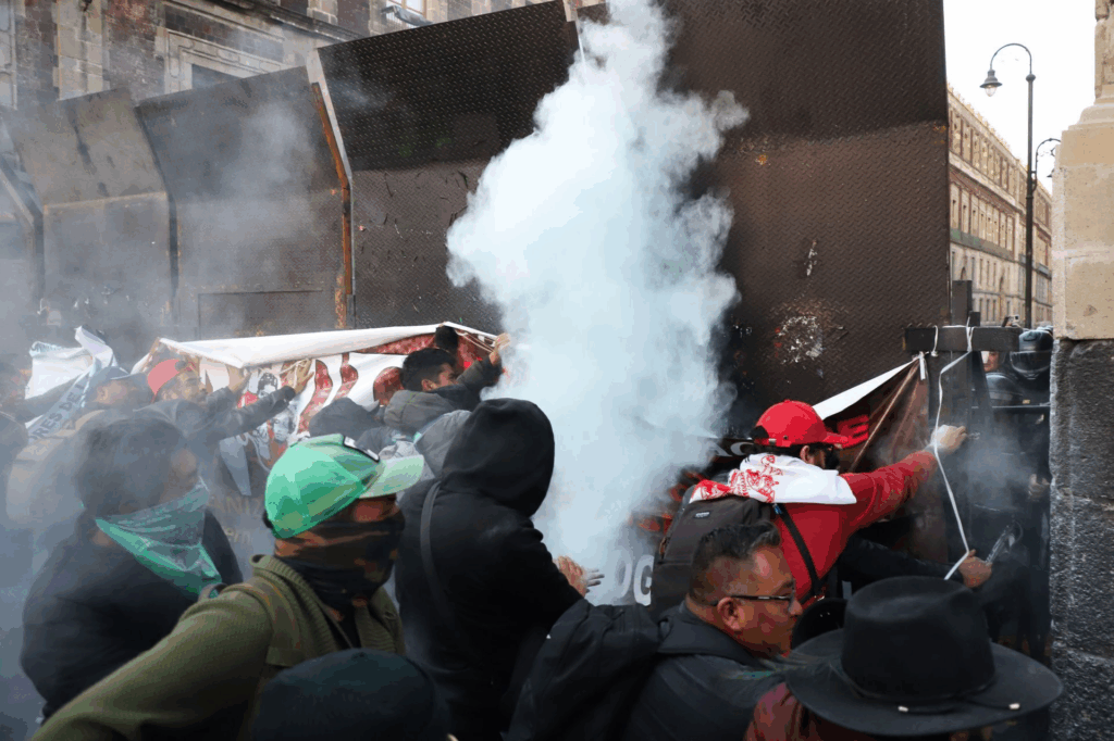 Los maestros se concentraron en la esquina de Correo Mayor y Moneda, donde golpearon vallas metálicas de más de tres metros con objetos y puños, intentando derribarlas mientras se desarrollaba la Mañanera del Pueblo. En respuesta, policías de la Secretaría de Seguridad Ciudadana desplegaron gas irritante y polvo de extintores para contener a los manifestantes, generando conatos de enfrentamiento que duraron aproximadamente una hora.