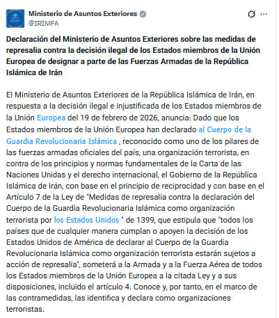 Irán, con base en una ley aprobada en 2019 que prevé represalias contra países que respaldan medidas similares adoptadas por Estados Unidos, extendió dicha normativa a las fuerzas armadas europeas clasificándolas como grupos terroristas.