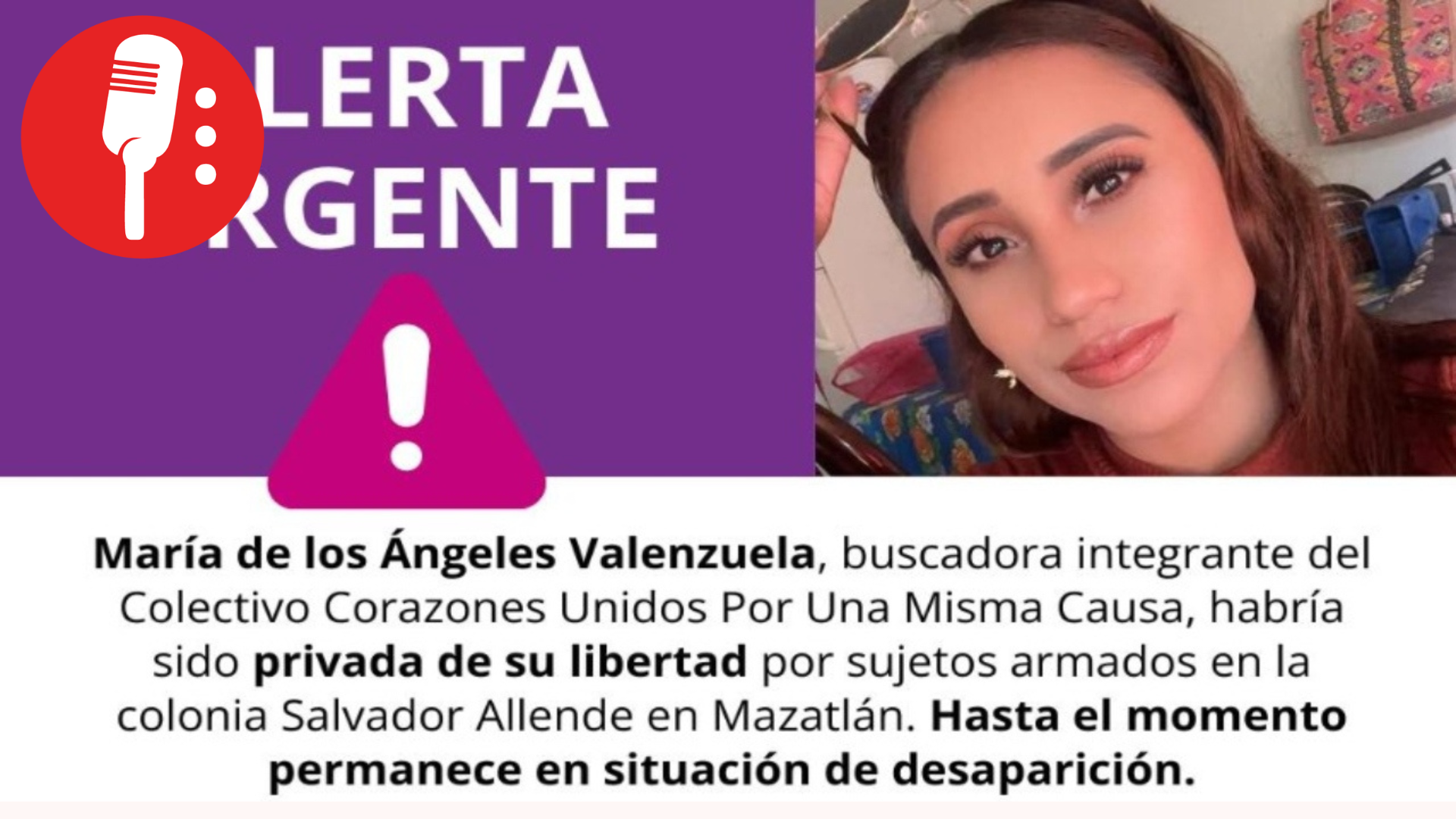 María de los Ángeles Valenzuela, integrante del colectivo Corazones Unidos por una Misma Causa, fue privada de la libertad el 14 de octubre en Mazatlán, Sinaloa, mientras regresaba a su domicilio tras acudir a una tienda. Su madre presenció el hecho y denunció públicamente la desaparición, pidiendo apoyo para localizarla: “Un carro blanco se acaba de llevar a mi hija María de los Ángeles Valenzuela. En la Colonia Allende en Mazatlán. Apóyenme a difundir para poder encontrarla. Cualquier información es valiosa”, escribió en redes sociales.