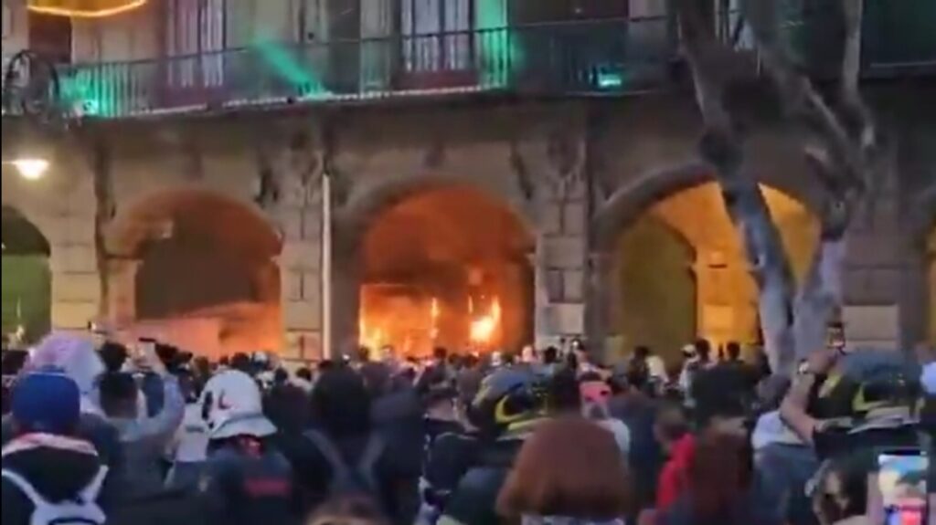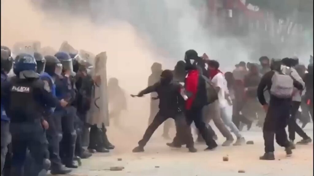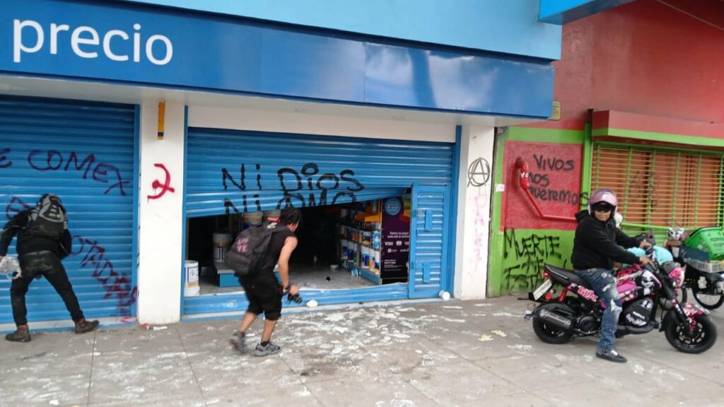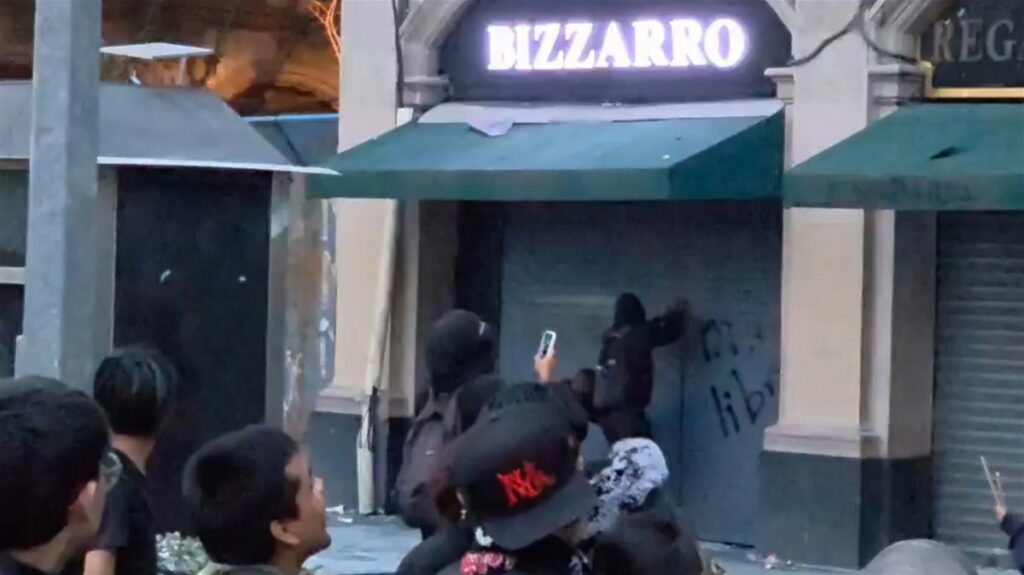 Un grupo autodenominado “Bloque Negro” fue el responsable de los actos violentos. Al llegar al Zócalo, estos encapuchados atacaron la joyería Bizarro. Con patadas, intentaron derribar la cortina del local y, al ingresar, robaron relojes, anillos y otros objetos de valor.